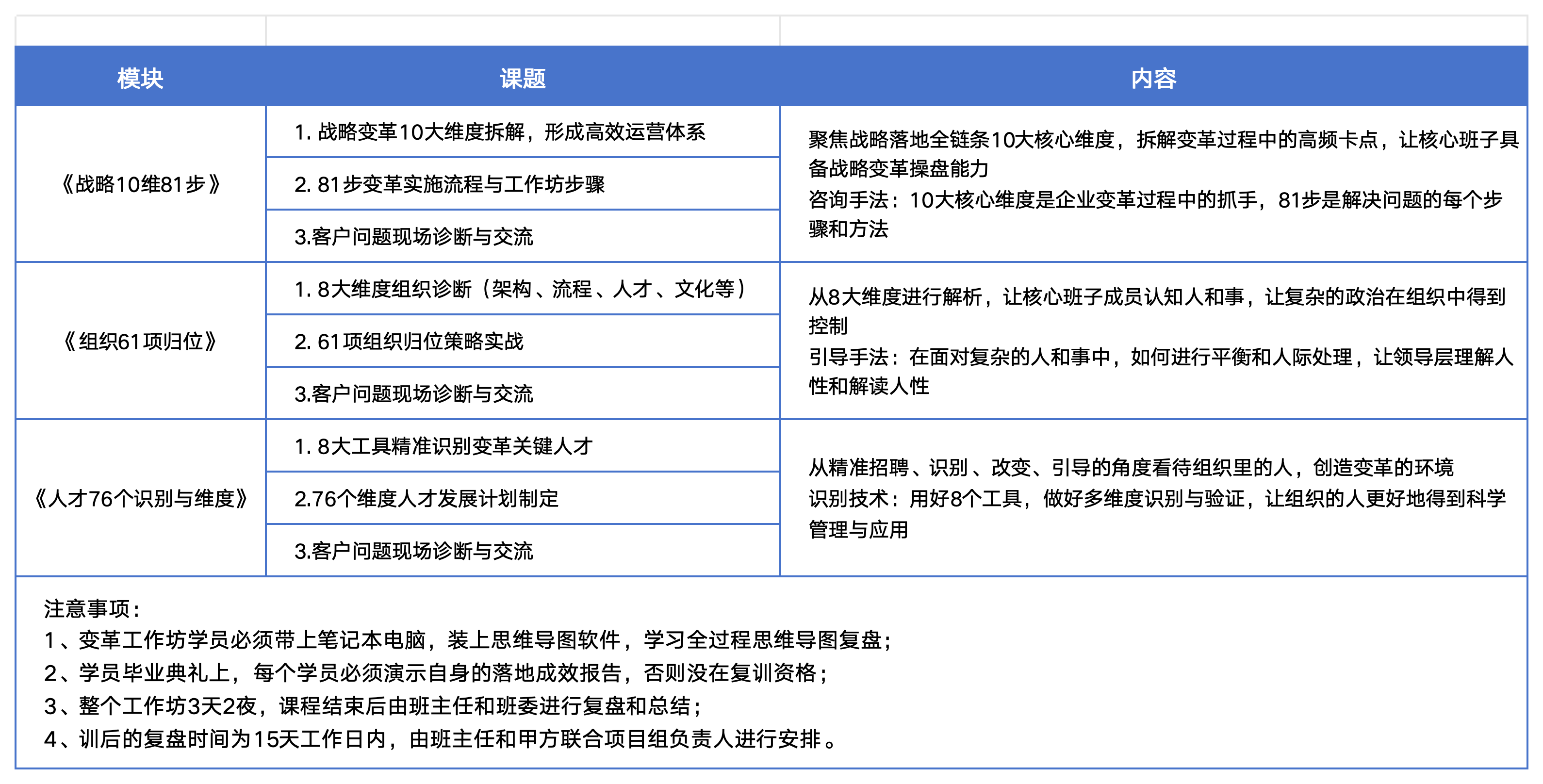 4. 植入行动学习闭环体系,训后形成企业内部变革小组,由顾问持续跟踪辅导变革落地。